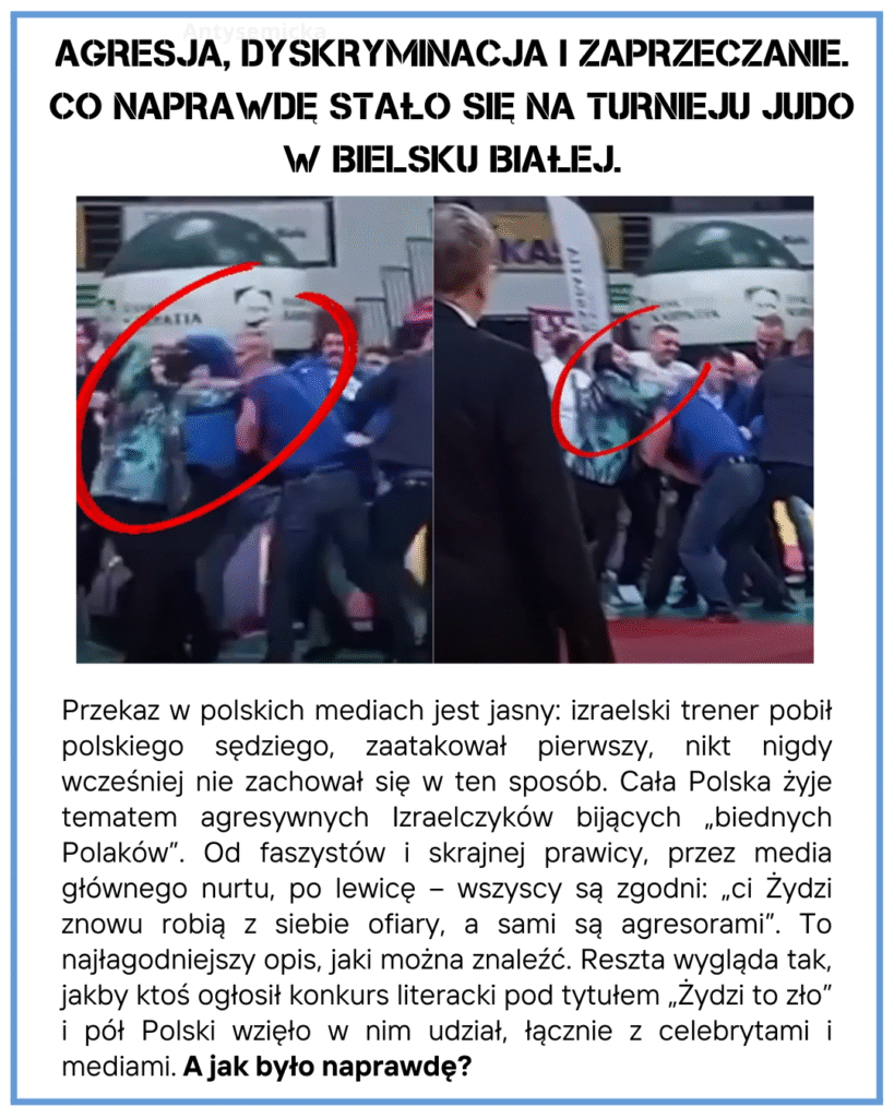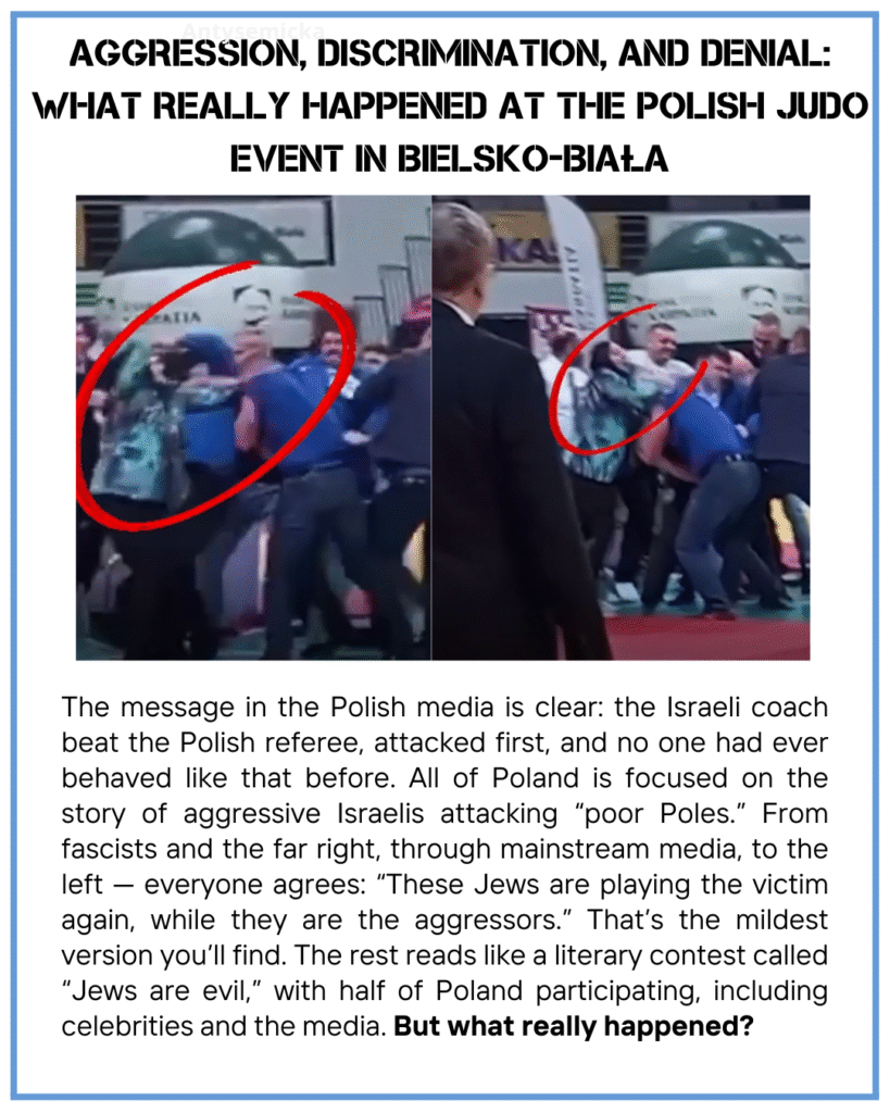 What really happened at the judo tournament in Bielsko‑Biała? The media portray “aggressive Israelis,” but the truth is far more brutal: discrimination, a lynch‑style attack, and antisemitism directed at young athletes. Read eyewitness accounts and watch the video that dismantles the manipulation and shows the facts that were suppressed.